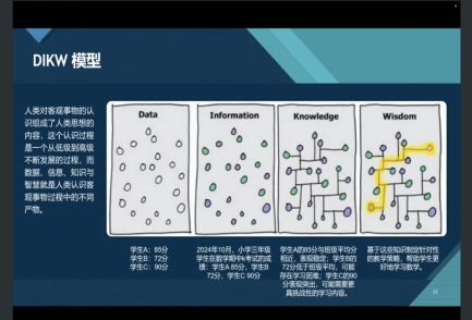 紧接着,黄老师详细剖析了教师数字素养与信息素养之间的联系与差异。他通过A2数字教育资源获取与评价、B2微课程设计与制作、C4支持员工创造性学习与表达等具体能力要求,让同学们对教师信息素养有了更全面的认识。此外,黄老师借助DIKW模型,深入浅出地阐释了数据、信息、知识与智慧间的内在联系,并引入波普尔的三个世界理论,极大地拓宽了听众的视野。