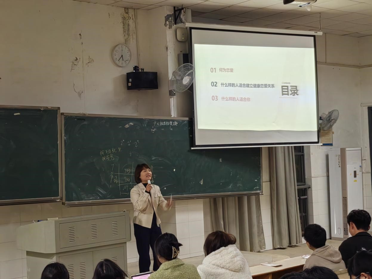 湖南湘江新区婚姻家庭调适服务中心的周浪老师以“恋爱成功法则——从识人到找人”为主题重点向同学们解释了三个问题:何为恋爱?什么样的人适合建设健康的恋爱关系?什么样的人适合你?讲座中,同学们积极发言,踊跃与周浪老师进行互动与交流。