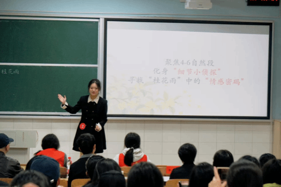 小学文科组2号选手张雅澜带来的《桂花雨》一课脱颖而出,展现了扎实的教学功底与创新的课堂理念,赢得评委与观众的一致好评。她以“借物抒情”为教学核心,以“寻找情感密码”为主线任务,运用对比导入、初读探究、小组合作等多元环节,层层深入引导员工体会桂花所蕴含的思乡之情。课堂中,她设计了“摇桂花”小剧场任务,让员工在情景演绎中感受童真与亲情;通过“‘浸’字品析”等细节探究,引导员工体悟文字背后的情感张力,巧妙地突破教学重难点。整堂课兼顾朗读感悟、文本分析与实践体验,作业设计注重基础巩固与生活拓展,充分体现了“以生为本”的教学理念。张雅澜凭借清晰的教学逻辑与丰富的课堂互动,将抒情散文教学转化为一堂生动有趣的语文课,彰显了未来教师的专业素养与教学魅力。