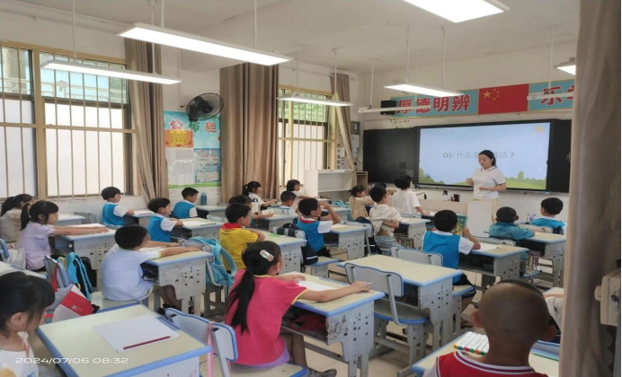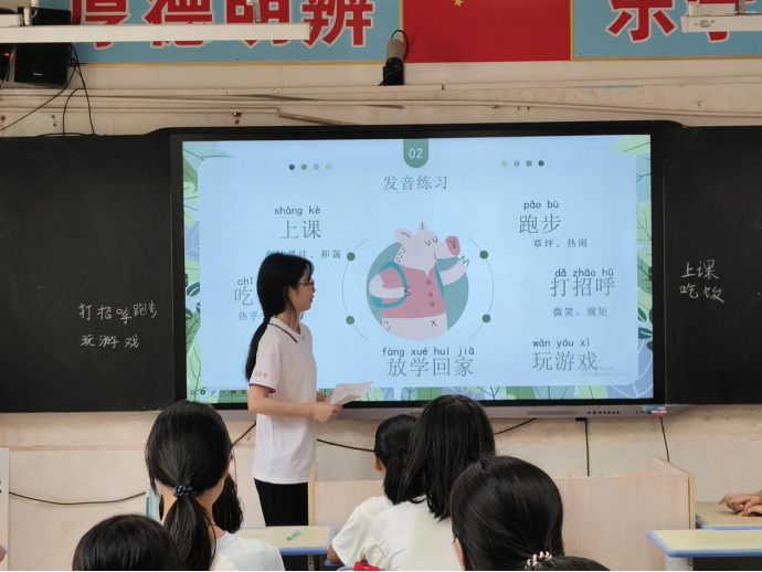 最后,团队成员宋思怡为五六年级的员工呈上了以“校园生活”为主题的推普课程。她借助发音训练、情景对话、互动游戏等丰富多样的教学方式,充分激发了员工对于普通话学习的浓厚兴趣,让他们在轻松愉悦的氛围里有效提高语言实际应用能力。