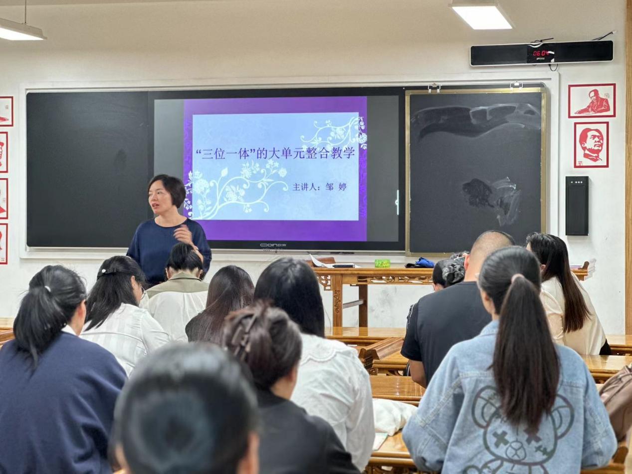 最后一个环节,邹婷老师作了《“三位一体”的大单元整合教学》专题讲座。她以布鲁姆“有效的学习始于准确地知道要达到的目标是什么为基点”导入,系统、细致地为大家剖析了课标、教学、教材的内涵与关联,以及课程体系、单元编排、单篇教学三者之间的关系,并结合真实的课例,解读如何落实以核心素养为导向的三位一体大单元教学。