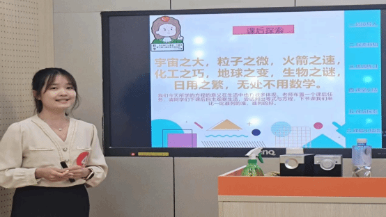 小学数学4号选手刘依贝在教学中,巧用各个天平的状态,写出等式与不等式,在相等与不等的比较中进一步体会等式的含义,带领员工初步感知方程。